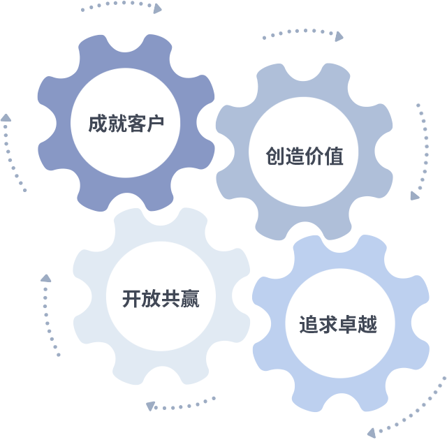 成就客户是一切决策的出发点,,创造价值是衡量所有工作的标准,,,,追求卓越是我们做事做人的态度,,开放共赢是我们的格局也是最终的结果。。价值观的齿轮环环相扣,,,,推动着组织里的每个人不断向前。。。。